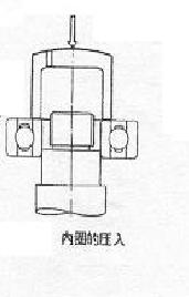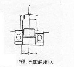 安装轴承时,务须在套圈的端面的圆周上施加均等的压力,为将套圈装入,严禁用榔头等重物直接敲击套圈端面以免损伤轴承。此外,如果对套圈的某一方(例如外圆)压入,这往往要在滚动面上造成压痕或擦伤,万不可采用,尤其是将非分离型轴承同时安装于轴于轴承箱上时,如图所示,用垫铁将内外圈均衡的压入。