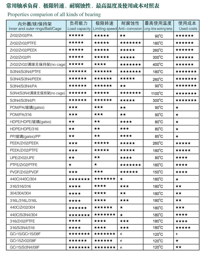 常用轴承负荷、极限转速、耐腐蚀性、最高温度及使用成本对照表